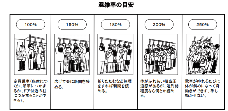 国土交通省が提示する混雑率の目安では、150%で新聞を広げて読める程度とされています。