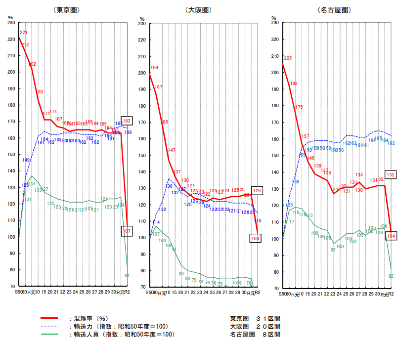 (引用:国土交通省 三大都市圏における主要区間の平均混雑率・輸送力・輸送人員の推移