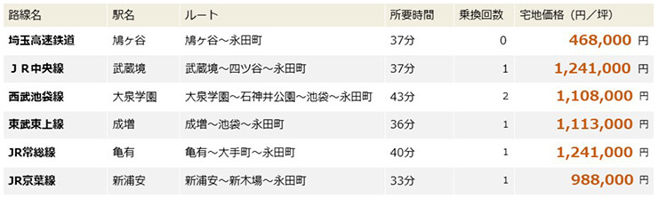 浦和美園駅発と鳩ケ谷駅発それぞれのルートについて、通勤時間が同程度の5駅と地価を比較した場合、次のとおりでした。