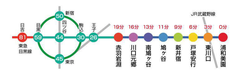 都内の主要駅に乗り換え0~1回程度で辿り着けるため、直通している東京メトロや東急目黒線方面に向かう場合は、さらに長い時間、座ったまま通勤できます。