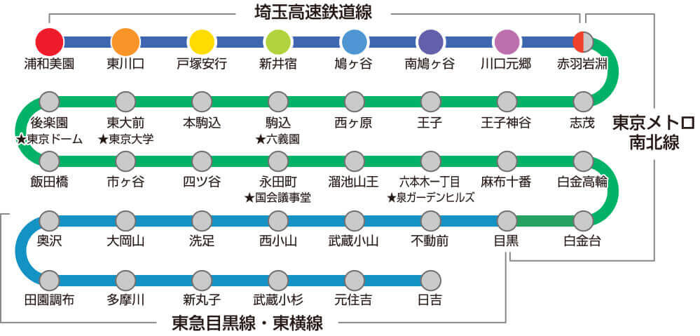 埼玉高速鉄道(埼玉スタジアム線)は赤羽岩淵駅から浦和美園駅まで、川口市を中心に東京都北区・さいたま市を結ぶように南北に伸びた路線です。