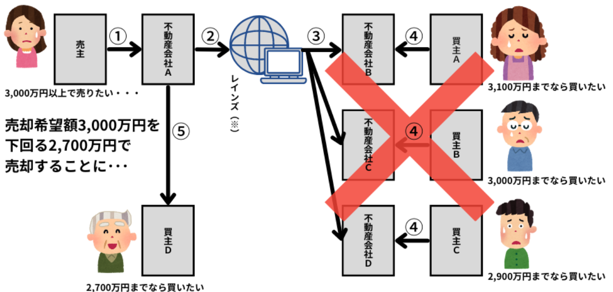 図4の例では3,100万円で買いたい人がせっかくいたにもかかわらず、不動産会社A社が見つけた2,700万円で買いたい人に売ることになってしまうのですね。
