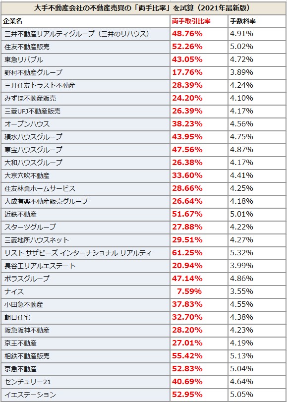 大手不動産会社29社のうち6社が両手比率50%を超えていることがわかります。