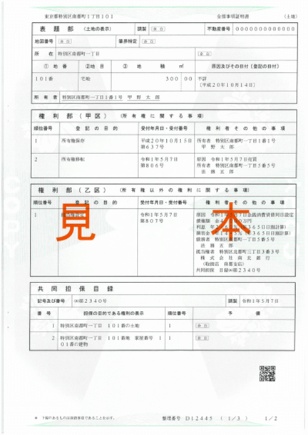 この画像の例であれば、「法務五郎さんが甲野太郎さんから」「令和1年5月7日に」「この土地を購入して」所有者になったということが証拠として残っているわけです。