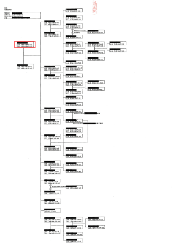 赤枠で囲まれているのが、元々の土地の所有者です。昭和40年にこの所有者の方が亡くなり、調査時点(平成30年)では、相続によって25名がこの土地の所有権を持っていることが示されています。