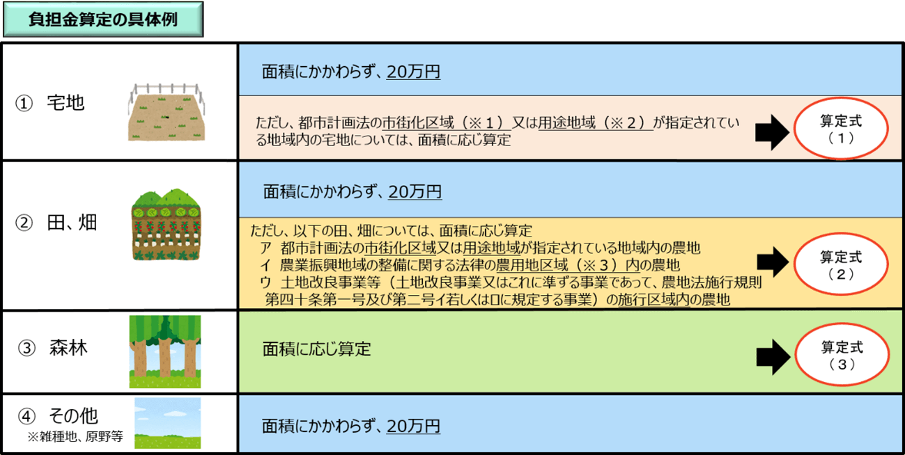市街化区域の30坪の宅地と2ヘクタールの農地・10ヘクタールの山林について負担金を算出してみました。