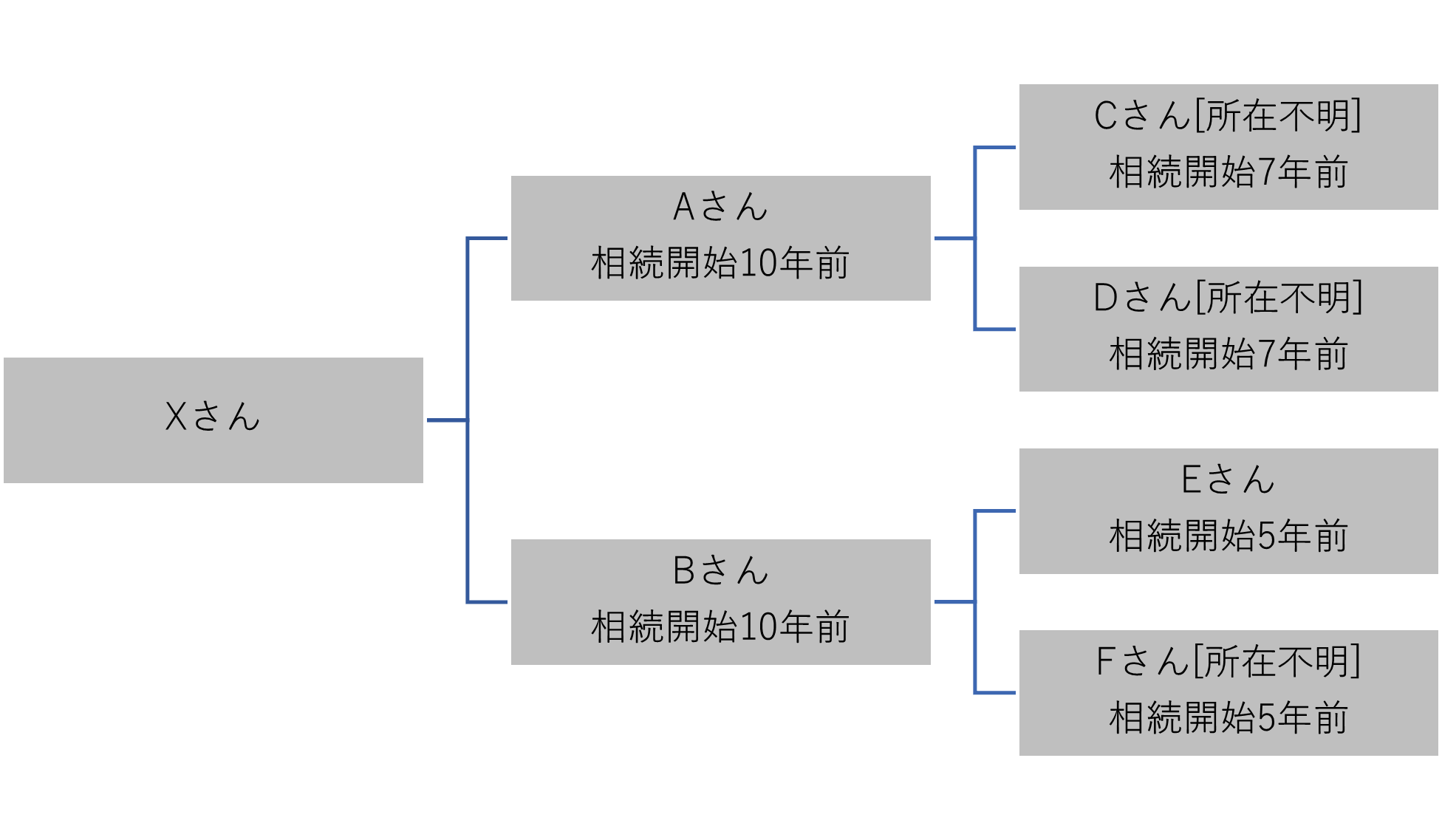 Xさんの不動産は現在C・D・E・Fさんが相続しているのですが、Eさん以外は所在不明となっています。
