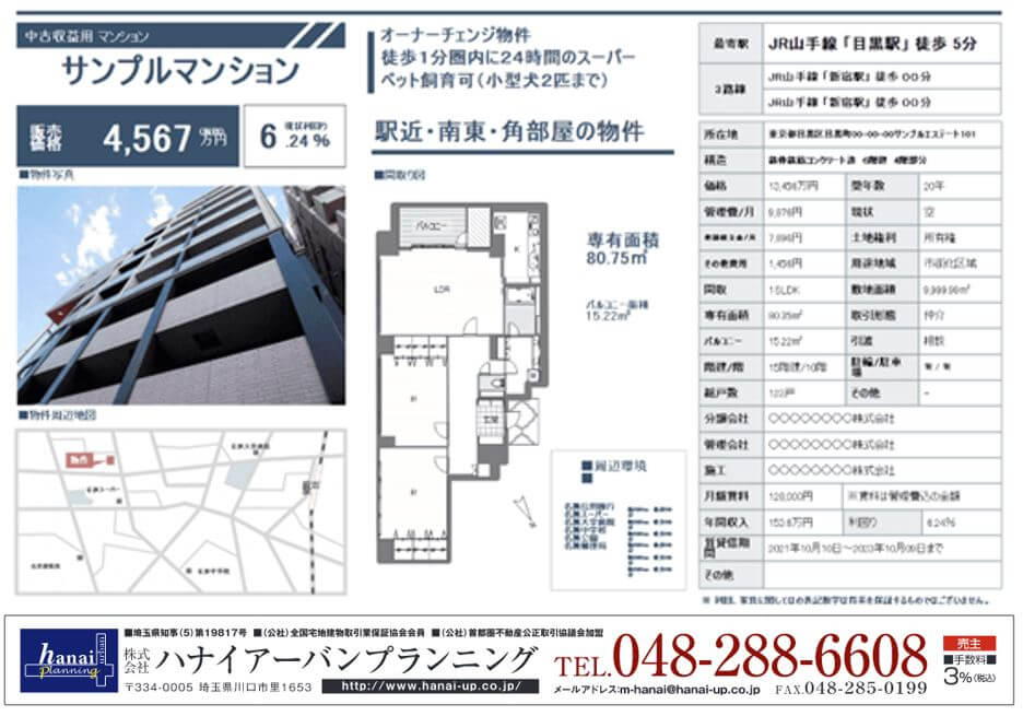 販売活動を行う上で絶対に必要になるのが販売図面で、「マイソク」ともいいます。販売図面とは物件の住所、間取り、地図、築年数、写真などを1枚にまとめた紙の資料です。