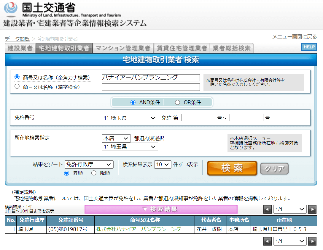 ただ、不動産屋のWebページに書かれていることをそのまま信じるのは危険です。本当にその宅建業免許番号の免許を持っているか、国土交通省の建設業者・宅建業者等企業情報検索システムというデータベースから確認しましょう。商号(事業者名)と免許番号や所在地から簡単に検索できます。