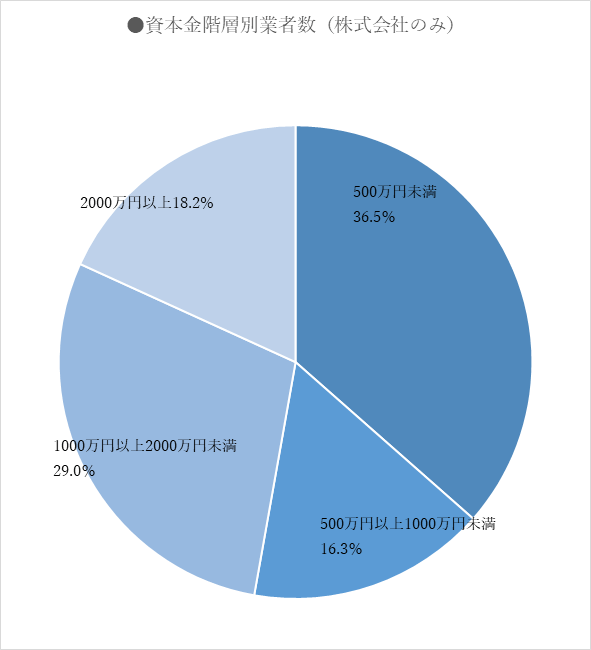 さきほどの統計で、「資本金の階層別による株式会社のみ」の業者数をまとめました。「500万円未満」の業者が 36.5%、「500万円以上1000万円未満」の業者が 16.3%、「1000万円以上2000万円未満」の業者が29.0%で、資本金2000万円以上の規模の会社は全体の20%以下となっています。大半が資本金2000万円未満であり、不動産会社のほとんどは、会社の規模としては大きくないということがわかります。