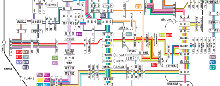 駅からのバス路線も充実しており、東西南北の各地区に路線が延びています。駅の東口、西口から利用できるほか、少し離れた鳩ヶ谷駅JA前、昭和橋からもバスが利用できます。