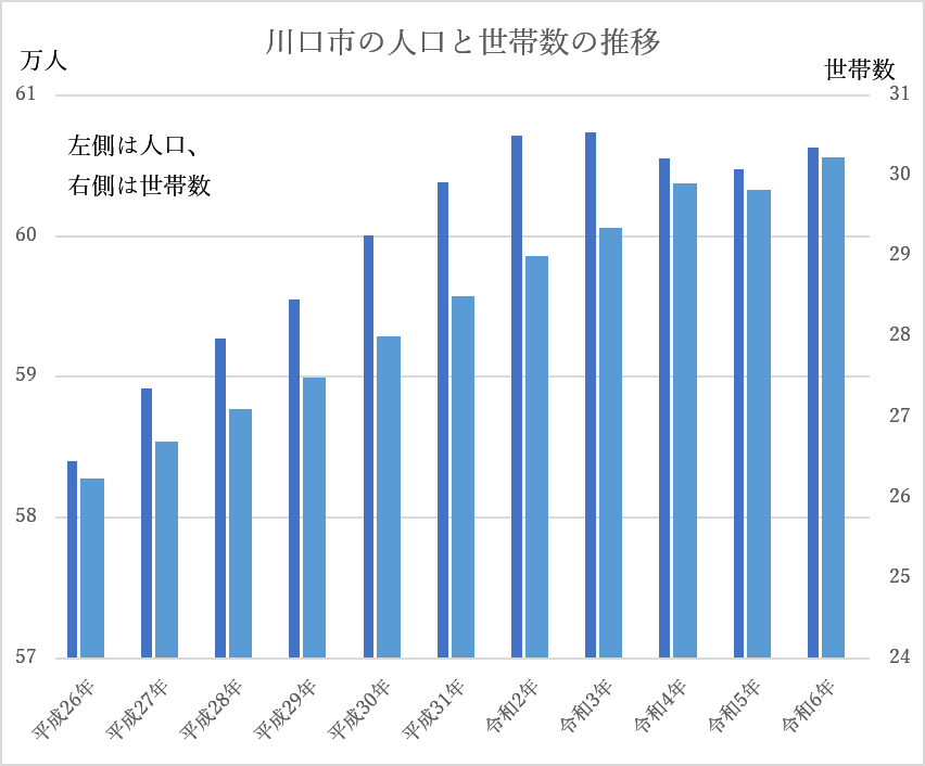 それは人口にも現れています。コロナ禍中にいったん、人口は減少しましたが、平成26年(2014年)の人口は58万3989人、世帯数は26万2302でしたのが、令和6年(2024年)には60万6315人、世帯数30万2335となりました。この間を比べてみると人口は2万人強、世帯数は4万超も増えています。
